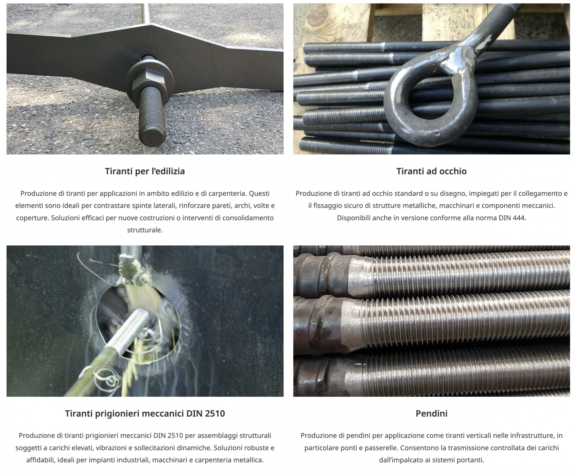 La nostra produzione si concentra su tiranti, tirafondi e cavallotti, realizzati acciaio da costruzione, acciaio bonificato e acciaio inox, sempre e comunque impiegando materiale proveniente da acciaierie europee.